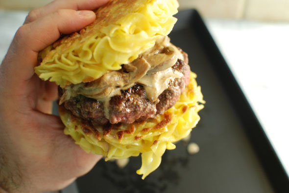 Brought to us by The Food In My Beard, the alternative bun is made possible with molded egg noodles. It’s finished off by topping the burger with the traditional Stroganoff onion/mushroom mixture. The ‘how to’ can be found here, so you can be stroganoffing in no time.