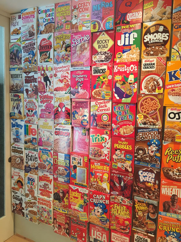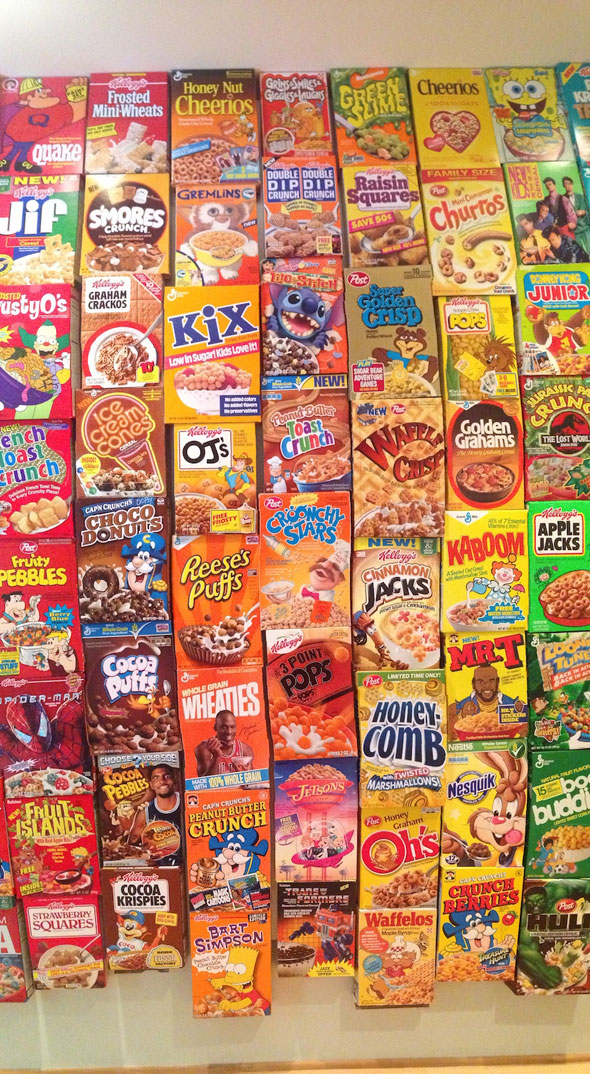 Using dozens of cereal boxes from his vast collection, Gabe adhered them to a metal-plated wall using magnets. He also had the wherewithal to arrange them by color, creating a mascot-laden spectrum of awesomeness.