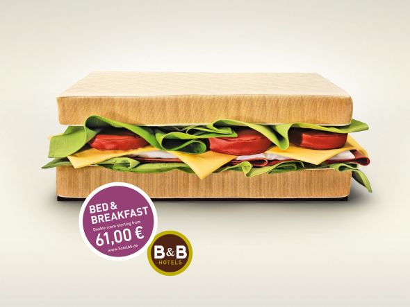 This series of print ads was created for German hotel chain, B&B Hotels, as a promotion for their recent bed and breakfast specials. Brilliantly combining the idea of bed and breakfast in one image — a hotel bed has never appeared so delicious.