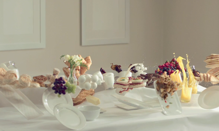 Breakfast Interrupted takes the most important meal of the day, and sends it flying — artfully. Shot at 1000fps, bacon, eggs, muffins, and other breakfast fare are quickly — or actually quite slowly — launched airborne.