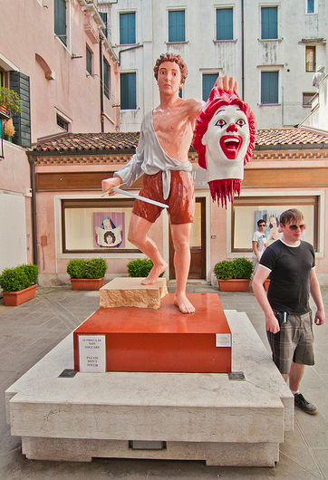 Spotted in Italy is this modern take on Perseus Beheading the Medusa. Ronald McDonald, the Titan of creepy clowns and McDonald’s mascot, is shown sans head.