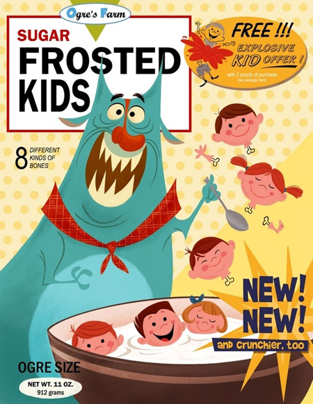 In what appears to be an unfortunately abandoned project, Kreepsville Industries commissioned art for a coffee table book, featuring creepy cereal mascots and grotesque breakfast options. When completed the book was to have over 70 pieces from some of the best illustrators in the business.