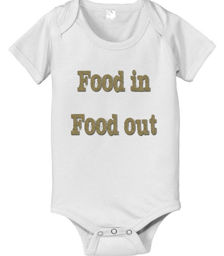 The Food In Food Out baby bodysuit is brought to us by Etsy user gatetim. Just remember that this is only cute for the first month —  then God puts odor in the poo-poo.