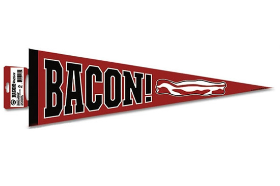 Do you root for team bacon? Well show your support like a 1950s sports fan, or a pre-war Ivy League coed, with the Bacon Pennant. Hang one in your bedroom, or impale it on the end of a wooden stick and rah rah pork fat. Go Bacon! Beat those Veggies!