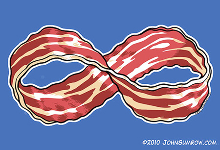 For those who prefer their meat candy forever, there is Infinite Bacon — a t-shirt by John Sumrow. Inspired by the art of M.C. Escher and pork, the shirt is available at Sumrow’s online store.