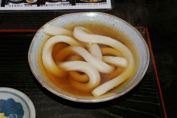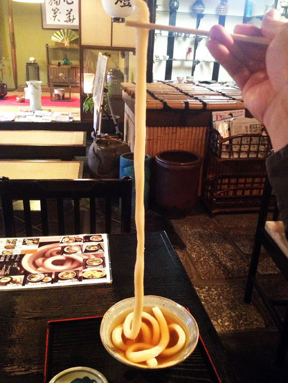 The noodle shop makes this one particular form of udon where, rather than a series of noodles intermingling in a pool of broth, Tawaraya fills the bowl with one long continuous noodle. Good luck trying to slurp that thing.