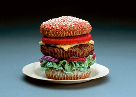 Ed Bing’s series Delectable, uses colored thread and thousands of knots to create fluffy non-edible versions of comfort food. The series includes an almost good enough to eat cheeseburger, an ice cream sundae, and a cupcake complete with rainbow sprinkles.
