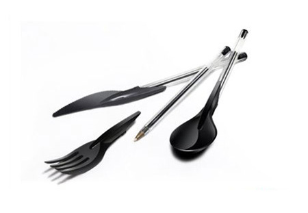 Made from food approved materials (oh good) the design takes the iconic [read: useless and antiquated] Bic ballpoint pen, and re-imagines it as a set of pen cutlery by adding a fork, spoon, and knife to the cap. Finally be able to cut your office’s plastic utensil budget, and be encouraged to eat at your desk… again.