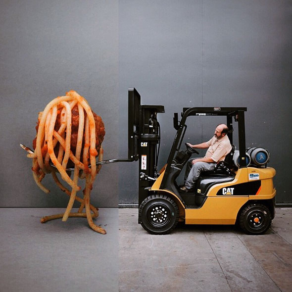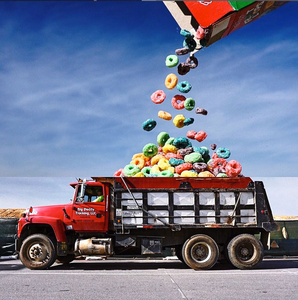 The result is a fun photo series of juxtaposed people and objects, using contrast in scale to mess with our minds. And, who wouldn’t want a truckload of Fruit Loops? See… he’s messing with our minds!