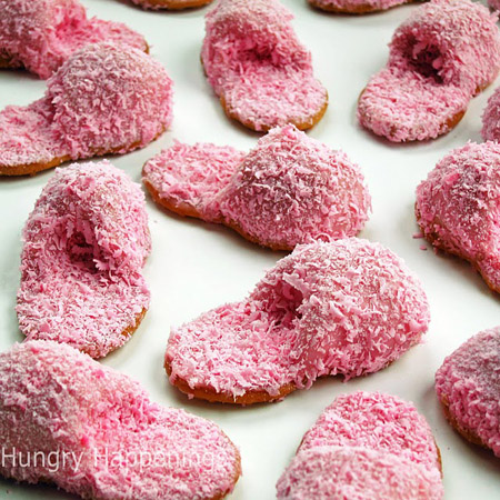 Pink Fuzzy Slipper Nutter Butter Cookies are by Hungry Happenings. Simply scrape off and mold the peanut butter-like filling from a Nutter Butter, and dip in some shredded pink candies.