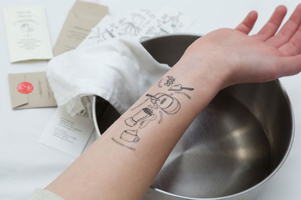 The series consists of recipes that can be applied to the body as temporary tattoos. It’s the perfect way to sneakingly reference your info, without missing a beat at the stove.