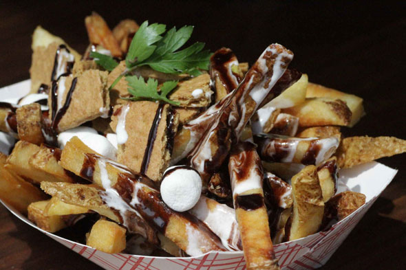 The answer to your brand of munchies includes; french fries, topped with toasted marshmallow sauce, chocolate sauce, crushed graham crackers and more tiny marshmallows. Enjoy, as the next morning is probably gonna suck.