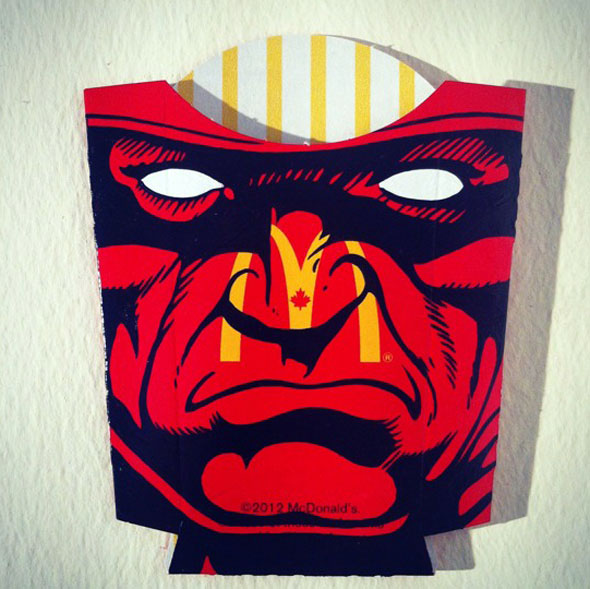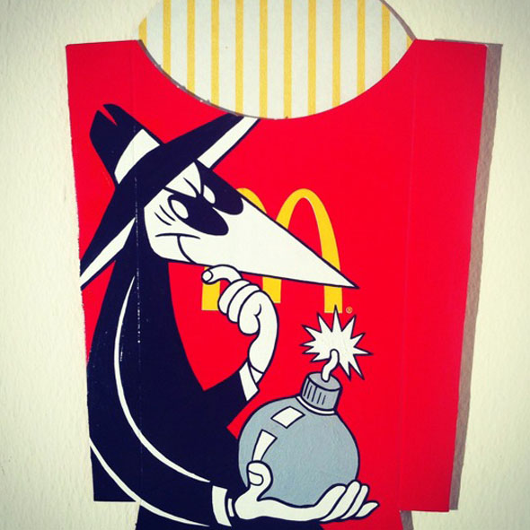Australian artist Ben Frost, using the bold red and yellow packaging of McDonald’s french fries as canvas, recreates pop culture icons. Frost takes inspiration from graffiti and sign writing, using sharp lines and bold colors to help his subject stand out — even when competing with the garish colors of the fries box.