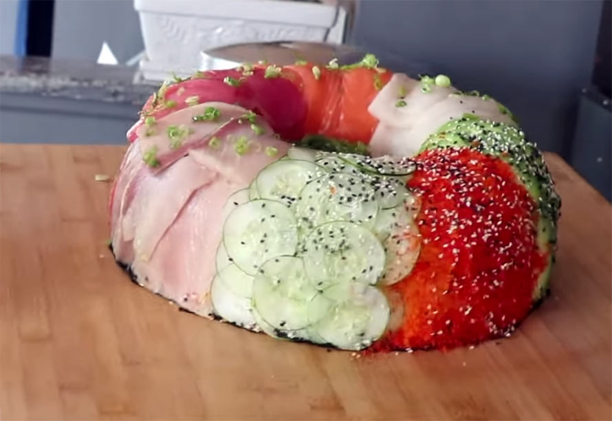 Brought to us by Hellthy Junk Food, the giant ring of raw fish and rice starts with 6-lbs of sushi rice. After being molded into donut-form, the rice is topped with ahi tuna, salmon, escolar, yellow tail, cucumber and avocado amongst others. See how it’s done below.