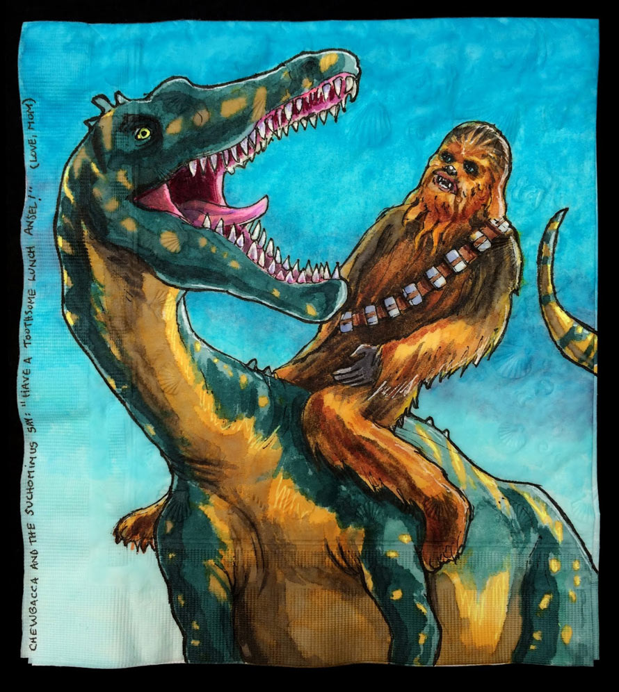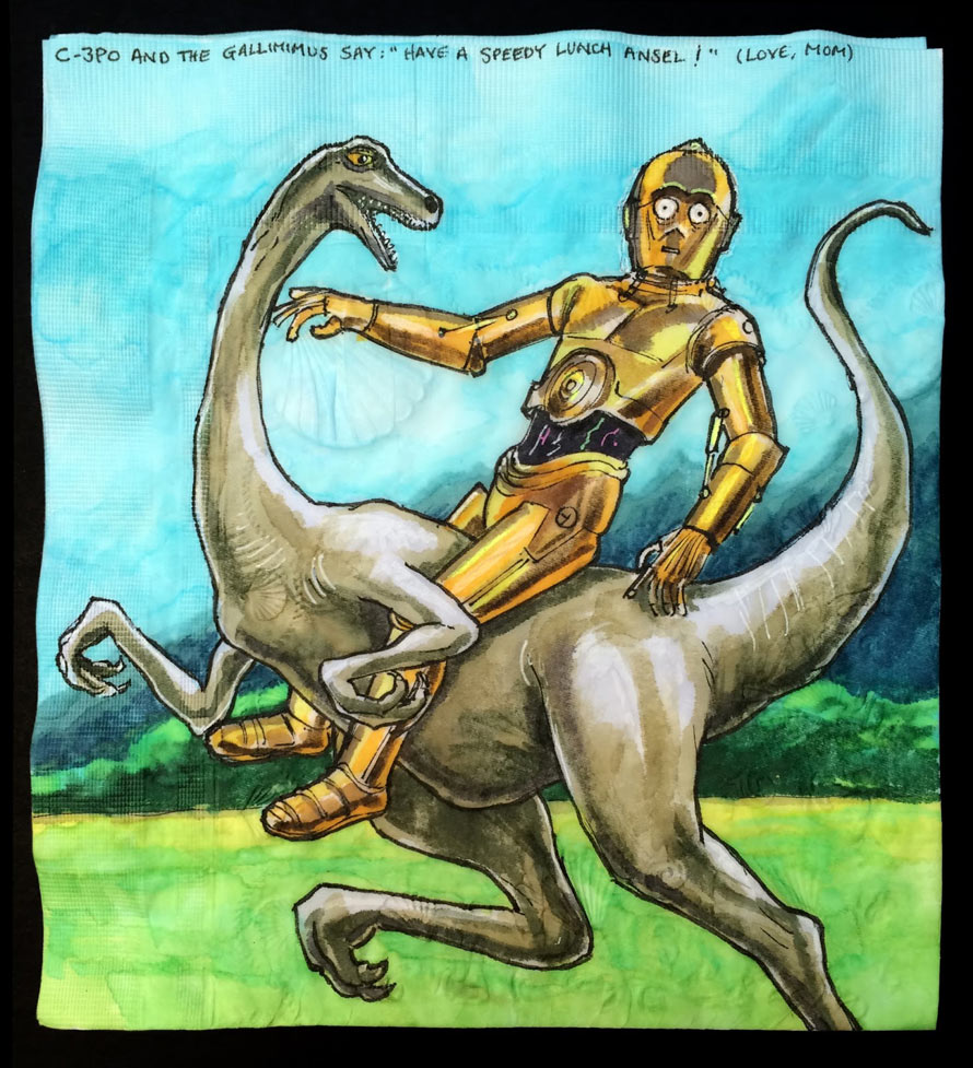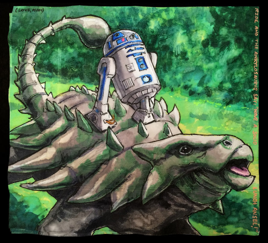 At the time of this writing, children are only interested in three things… Star Wars, dinosaurs, and lunch. Brooklyn-based artist Nina Levy knows this, and creates Lunch Napkin Illustrations of Star Wars Characters Riding Dinosaurs.
