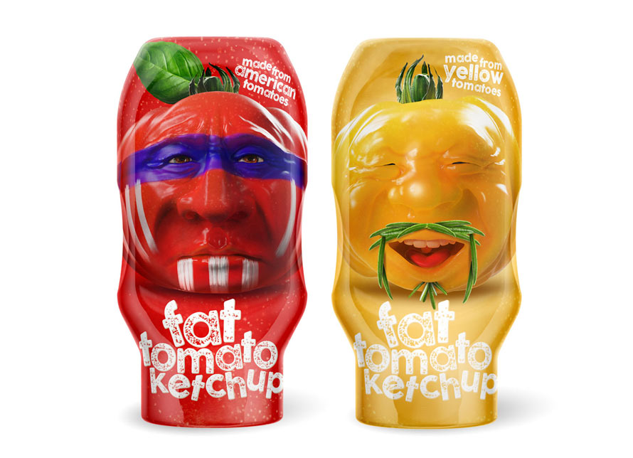 There’s a new packaging concept for Fat Tomato Ketchup that comes in two varieties, red and yellow. The yellow version uses yellow tomatoes to pay homage to ketchup’s Asian origins, while the red is proud of its use of American tomatoes.