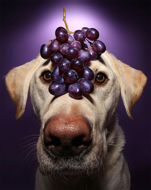 The extremely obedient dog can be seen in the series with various fruits balanced on his head, and a colorful background to match. Good dog.
