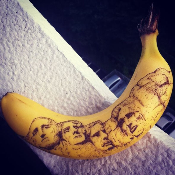 As a reminder, the art is created by sticking a pin into the banana’s flesh, that results in the color change. Cape’s banana pointillism is extremely time-consuming, with one piece sometimes taking more than five hours. We just hope that his family enjoys banana bread.