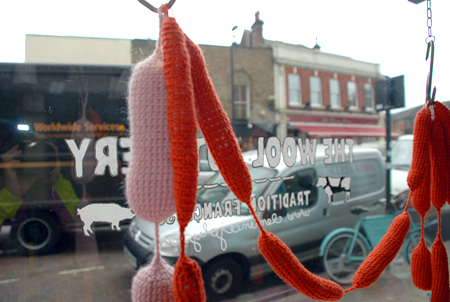 Artist Clëmence Joly has created a series of crocheted meat products titled The Wool Butchery. It has been displayed in the window of the London gallery and haberdashery “Fabrications” to appear as a genuine butcher shop.
