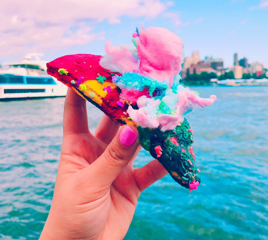 Brought to us by Industry Kitchen in NYC, the ‘pizza’ is round and cut into slices, but it’s actually a giant sugar cookie. What makes it worthy of being called ‘unicorn’ is that the rainbow cookie is topped with Pop Rocks, sprinkles, and cotton candy.