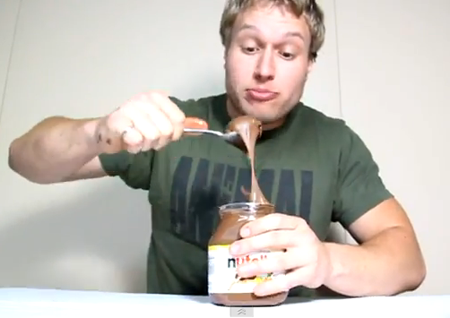 He tears in rather mightily, but appears to show some regret at the 1:28 mark, hits a food coma, then appears to get a second wind at around 2:21. At the video’s conclusion, he has consumed 750g of the chocolately treat, 4000 calories, 200g of fat, 400g of sugar, and is sporting a wicked Nutella stache. Enjoy.